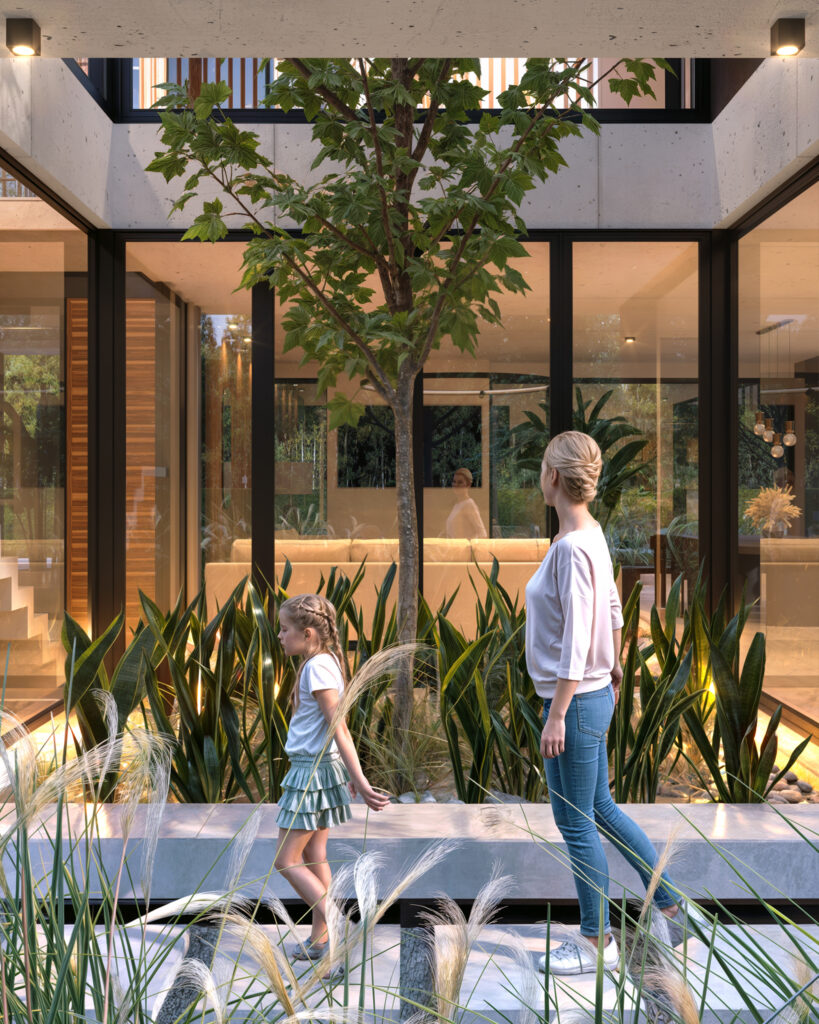En planta baja, el acceso se jerarquiza mediante un plano retranqueado que genera un semi-ingreso protegido, flanqueado por superficies acristaladas con celosías verticales de madera que filtran la luz y aportan privacidad