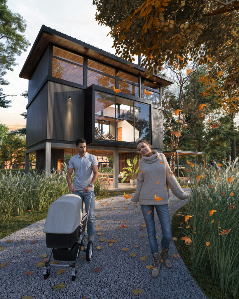 Los pilares liberan el plano del suelo, permitiendo una continuidad vegetal y una ventilación cruzada eficiente. La estructura es claramente legible, con una lógica casi tectónica, que no esconde sino que celebra los modos en que está hecha. La caja negra flotante —de líneas puras y superficies vidriadas generosas— encierra y expone al mismo tiempo: pone al habitar en contacto íntimo con el entorno natural sin perder la noción de refugio.